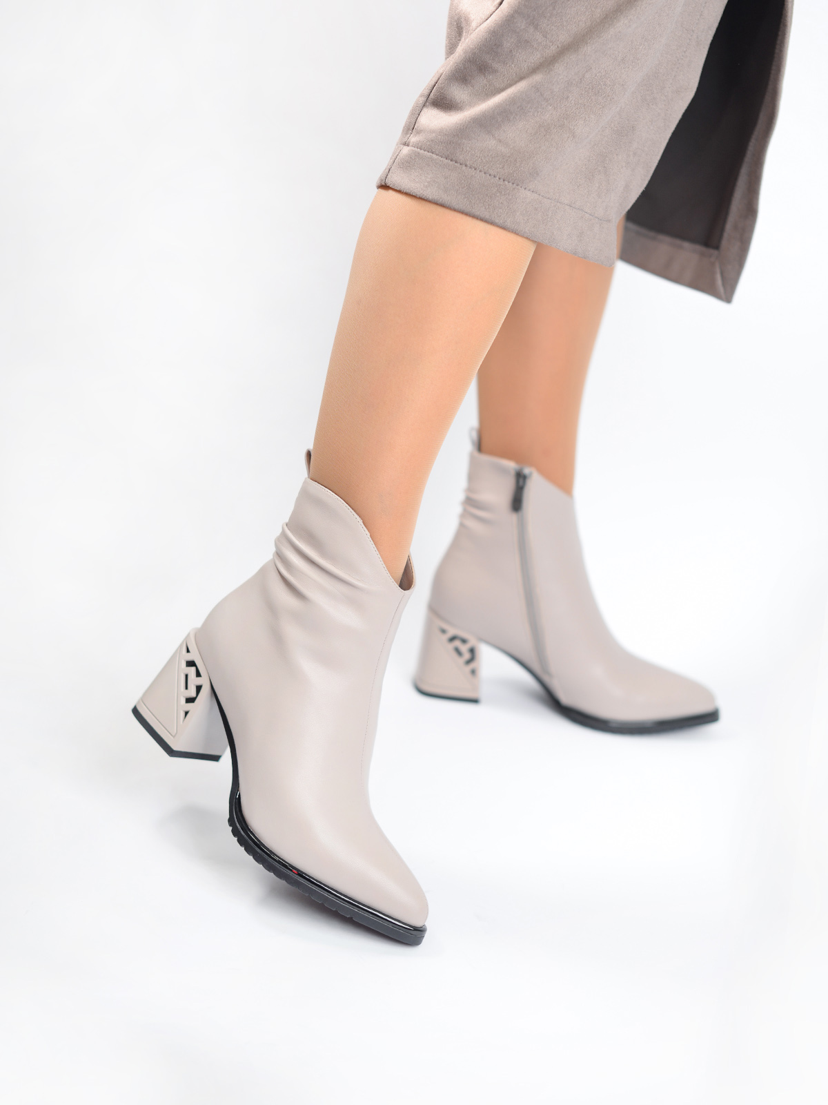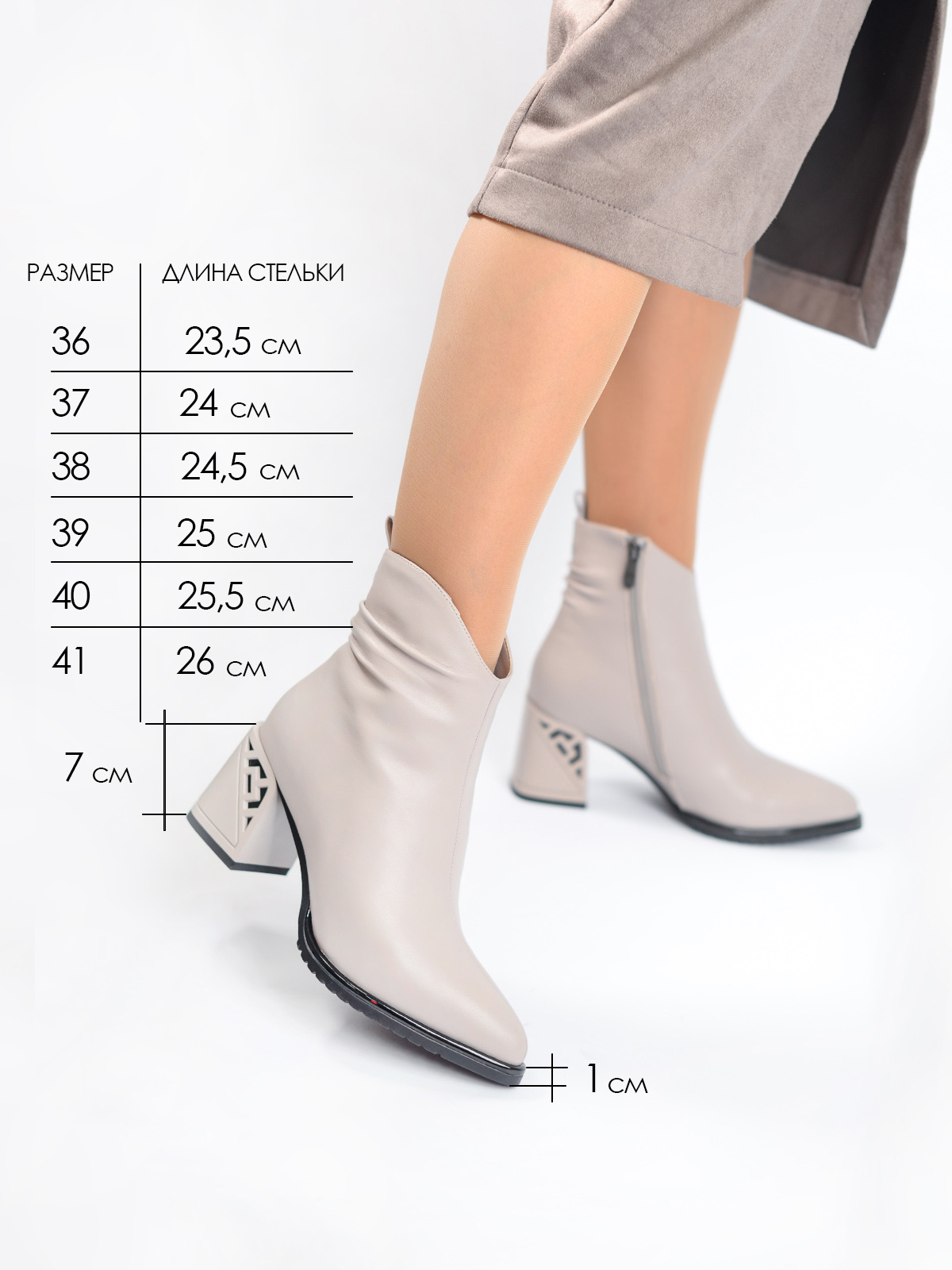 Верх из качественной натуральной кожи, подклад из натуральной шерсти, такое сочетание гарантирует надежную защиту и тепло внутри обуви. Материал подошвы - резина, обладает прекрасным сцеплением с поверхностями, нескользящий. Ботильоны на каблуке средней высоты, толстом и устойчивом, подарят уверенность в каждом шаге, визуально вытягивая силуэт. Красоту и стройность ног подчеркнет актуальный фасон - высокие, с узким носом и на среднем каблуке. Для удобства при надевании на каждый день с внутренней стороны расположена застежка молния. Женские ботинки Бенетти в универсальном сером цвете удачно дополнят как официальный, так и любой повседневный образ. Подойдут как для походов в офис, школу, так и для торжественных мероприятий, в театр, на вечеринку или юбилей. Женственный силуэт оценят как молодые девушки, так и взрослые женщины, отдающие предпочтение классике и комфорту.